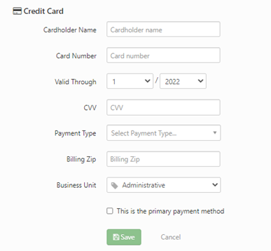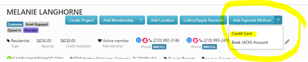 Once you are on the customer screen, at the top far right select the drop-down arrow for Add Payment Method. Then select Credit Card. NOTE: We will no longer be accepting Back (ACH) Accounts as a form of payment.